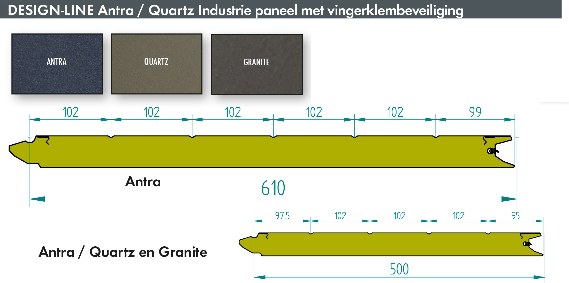 De panelen van de stijlvolle ANTRA zijn in 3 uitvoeringen leverbaar: ANTRA, QUARTZ en GRANITE. Deze panelen zijn geheel vlak zonder belijning en geven uw bedrijfsdeur een geheel eigen en stijlvolle aanblik. Evenals bij het umbra-design zijn deze metalen panelen 16mm van dikte, en met isolerende schuimkern. Deze stijlvolle panelen voor de industriële bedrijfsdeuren kunnen uiteraard tegen een stootje.