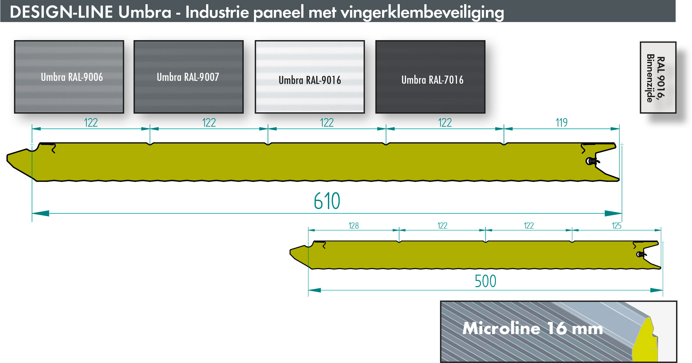 De panelen van het industriële UMBRA design geven uw bedrijfsdeur een sterke industriële uitstraling. De stevige metalen panelen van 16mm dikte, met isolerende schuimkern kunnen tegen een stootje en zijn in 4 industriële grijstinten verkrijgbaar. De kleur aan de binnenzijde van de panelen is standaard in de witte RALkleur 9002 met oppervlakte structuur STUCCO.
