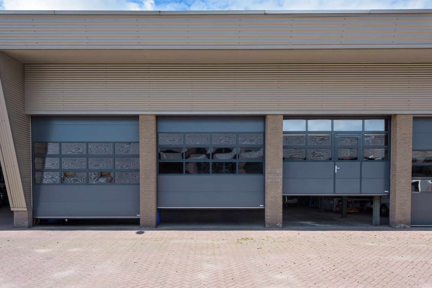 Voor een sterke en stijlvolle industriële uitstraling zijn deze deuren opgebouwd met aan de boven- en onderkant 2 microline UMBRA-design panelen. In het midden zijn 3 raam secties geplaatst die daglicht binnenlaten. De aluminium raam secties zijn gepoedercoat en voorzien van dubbel PRO-TEC kunststof beglazing. Voor het gebruiksgemak zijn er een aantal bedrijfsdeuren uitgevoerd met een ingebouwde loopdeur met lage drempel. Alle deuren zijn gecoat in Antraciet.